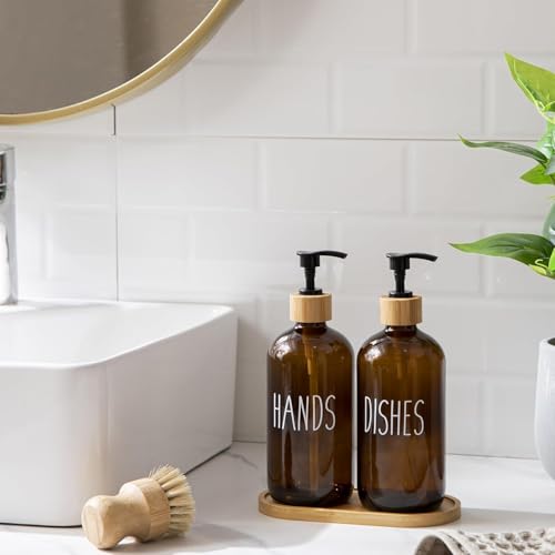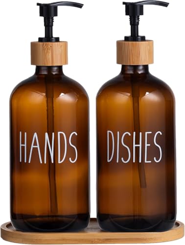 Generic - موزع صابون زجاجي للمطبخ، طقم موزع صابون لليدين والأطباق مع صينية من الخيزران، ديكور كلاسيكي حديث وأنيق والمطبخ والحمام والاكسسوارات - لون أصفر دافئ (Amber)