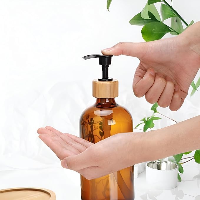 - تصميم أنيق: موزعات صابون زجاجية كهرمانية فاخرة مع طباعة حديثة، تكملها بشكل مثالي حامل خشبي طبيعي لتصميم حمام متطور