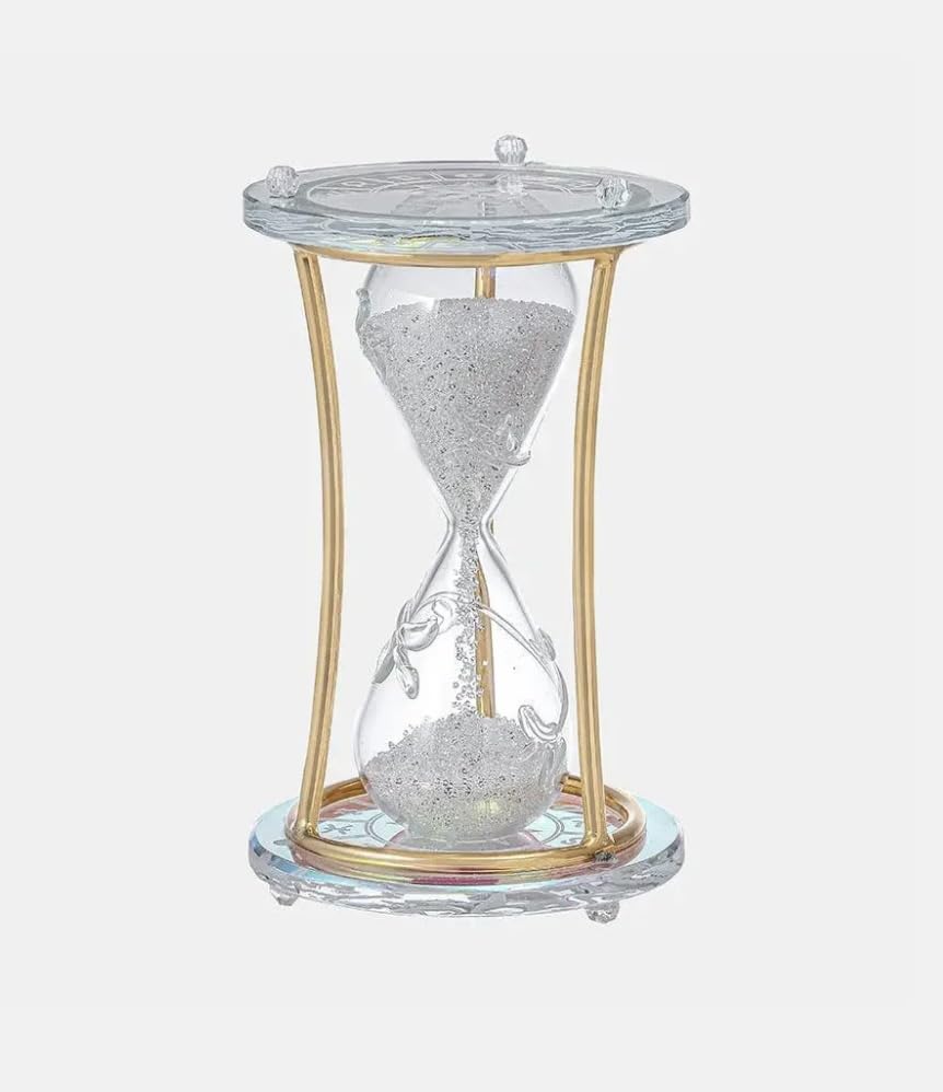 - تصميم أنيق وعصري: ساعة رملية زجاجية شفافة بإطار معدني ذهبي اللون، تضيف لمسة جمالية راقية لأي مكان