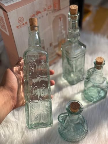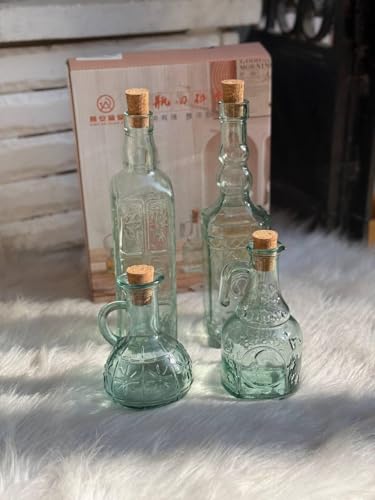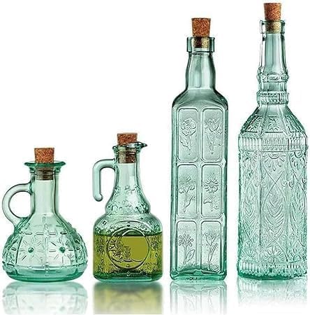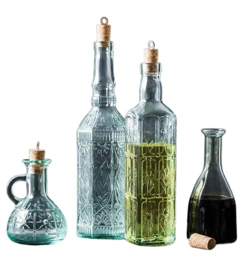 - VERSATILE SET: Collection of 4 decorative glass bottles in varying sizes and shapes, ideal for storing and serving oils, vinegars, and sauces