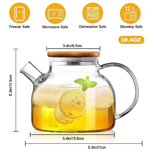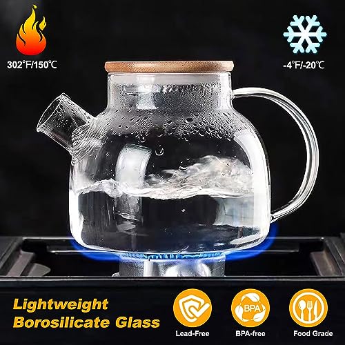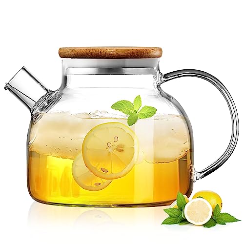 UYEIKMLOP - Glass Pitcher Stovetop Safe - Glass Carafe with Removable Filter Spout and Bamboo Lid - Durable and Sturdy Design - Tea Kettle for Hot/Cold Water - Ideal for Iced Tea, Coffee, Loose Leaf Tea (34 OZ)