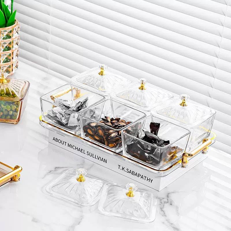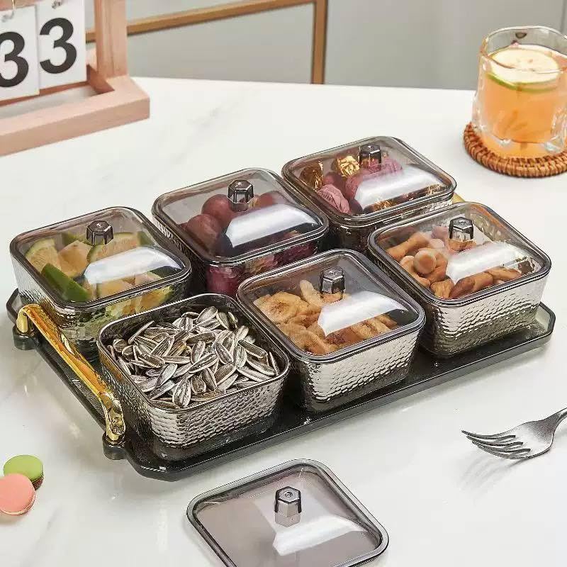 Generic - Glass Serving Set with Lids and Tray, 6 Compartment Snack Organizer with Acrylic Covers, Multi-Purpose Food Storage for Nuts, Candy, Desserts