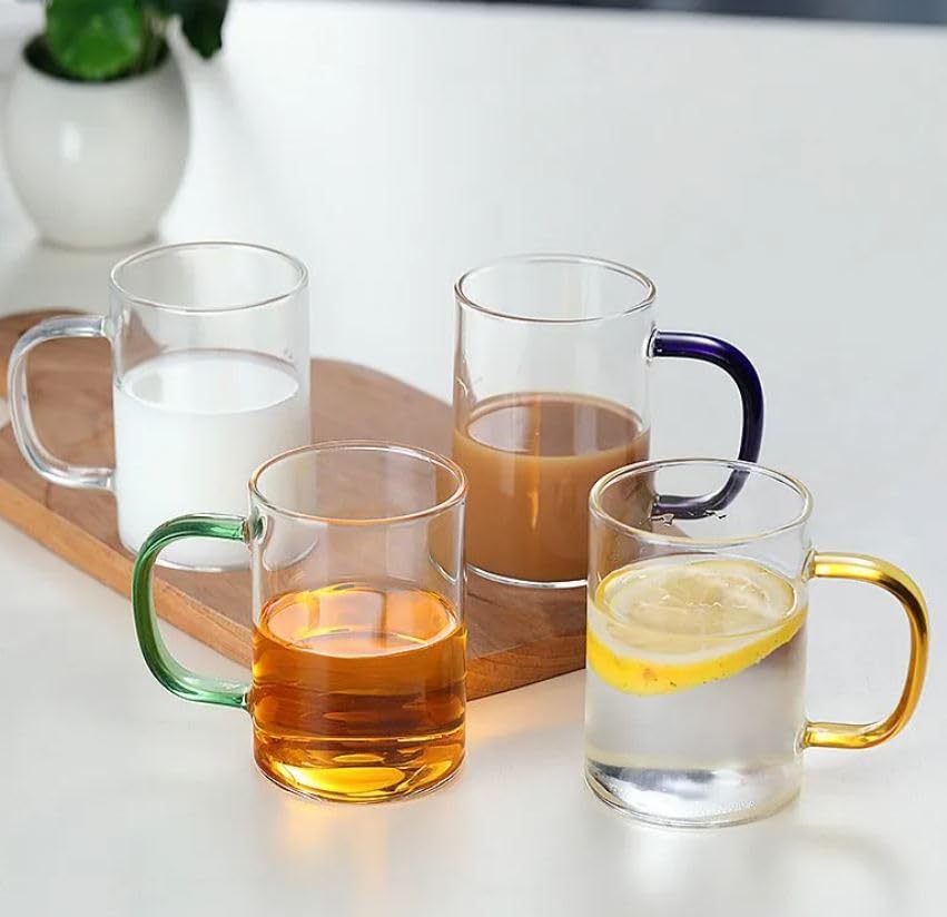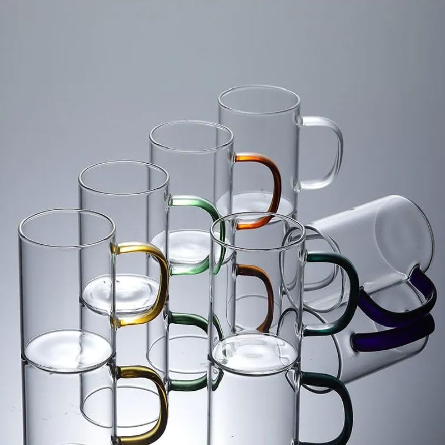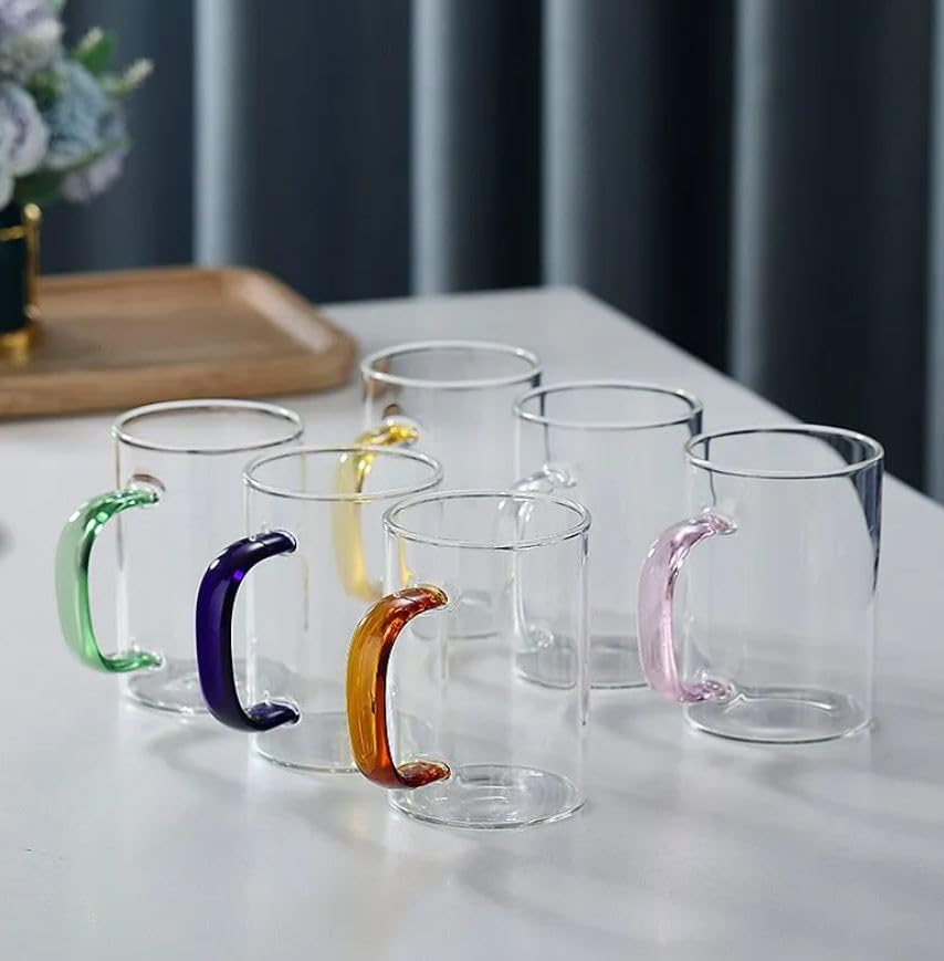 - محتويات المجموعة: طقم أكواب زجاجية مكون من 6 قطع بمقابض ملونة، كل كوب بسعة 300 مل - مثالي لتقديم الشاي الساخن أو القهوة أو المشروبات الباردة