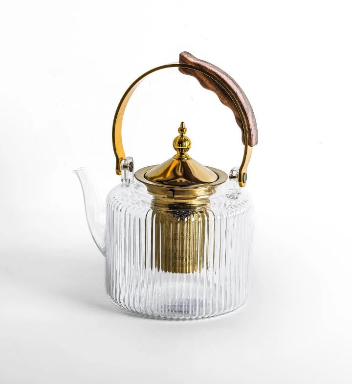 - غطاء ذهبي أنيق مع مصفاة: يتميز بغطاء جميل من الفولاذ المقاوم للصدأ بلون ذهبي مع جزء علوي مزخرف ومصفاة شاي مدمجة لتخمير أوراق الشاي السائبة.