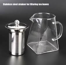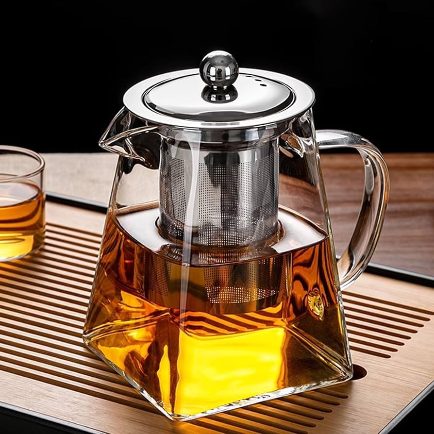 - Glass Teapot Square Shape with Stainless Steel Infuser & Lid, Borosilicate Glass Tea Kettle Stovetop Safe, Blooming & Loose Leaf Teapot,Glass Square Pot (550ML) Made with high quality borosilicate glass, strong and sturdy, it can withstand temperature from -20 ~ 160°C. Heat-insulated handle. With removable infuser, which made with food grade 304 stainless steel, very safe and easy to clean. Put the amount of loose leaf tea you need into the infuser and pour boiling water through the infuser into the teapot. on-spill Spout. Relax and enjoy. Maximum teapot capacity is 13 Ounce / 550 ML, you can make 3 to 5 cups of tea.