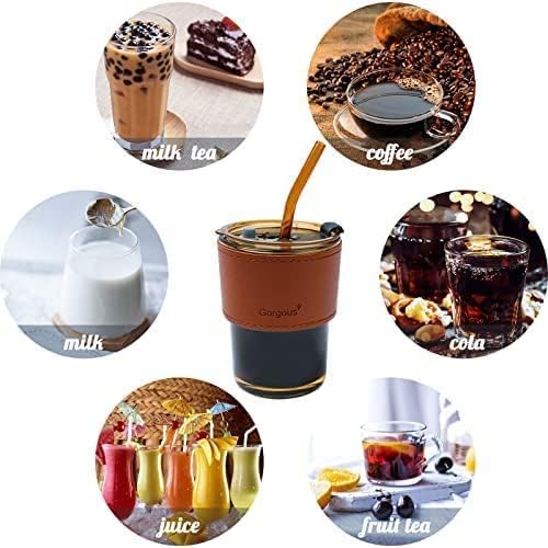 Generic - Glass Tumbler with Leather Sleeve 435ml, Dual Drinking Options, Silicone Straw and Lid (light brown)