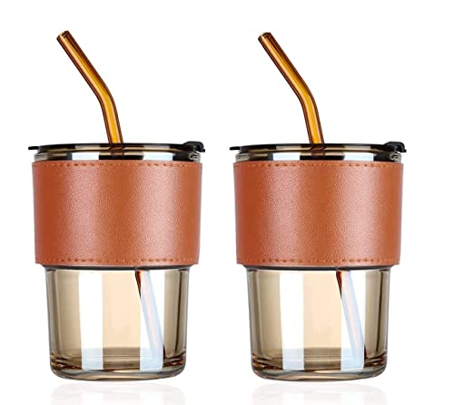 Generic - Glass Tumbler with Straw and Leakproof Lid and Leather Anti-Slip Handle for Hot and Cold Drinks, Tea, Coffee, Fruit Juices (Brown, 2)