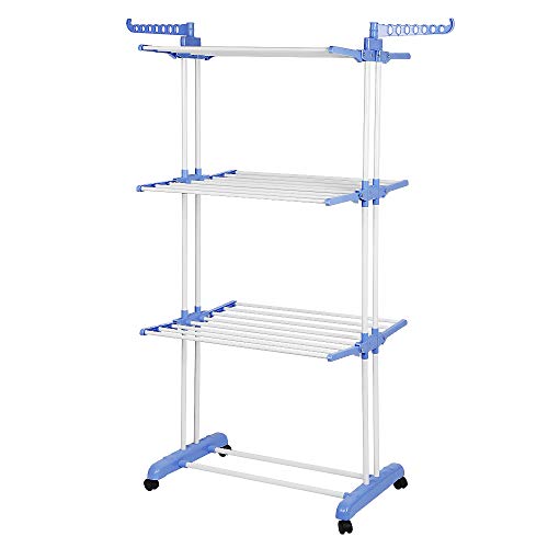 Gigrave - GLIT Folding Clothes Airer, Mobile Clothes Dryer, Clothes Airer, 4 Levels, 4 Wheels, Side Wings, Stainless Steel Tubes (Blue)