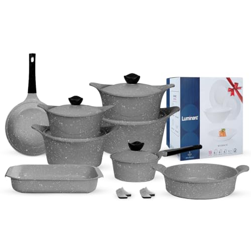 Glory - Glory Non-Stick Granite Cookware Set, 36 Pcs | Pots (18 + 20 + 24 + 28 cm) + Boat Dish 40 cm + Frying Pan 24 cm + Tray 28 cm + Saucepan 18 cm + 4 Holders | 19-Piece Essence Luminarc Gift Set | Grey
