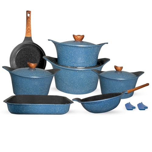 - Complete 15-Piece Cookware Set: Includes 4 pots in sizes 18cm, 20cm, 24cm, and 28cm, plus a 40cm oval roaster, 24cm frying pan, 28cm wok, and 4 protective holders for convenient handling