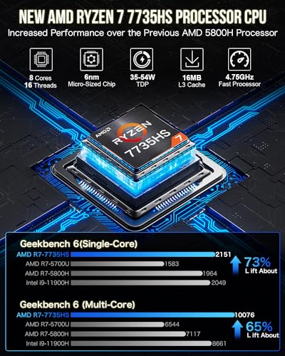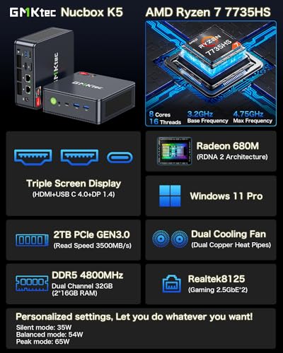 - 【كمبيوتر صغير للألعاب بسرعة】جُهِّزت سلسلة جي ام كي تيك نوك بوكس K5 بأحدث معالج AMD رايزن 7 7735HS، ثماني النواة/16 خيط، ساعة أساسية 3.2 جيجاهرتز، تصل إلى 4.75 جيجاهرتز، بناءً على بنية زين 3+ المثبتة مسبقًا مع ويندوز 11 برو، يوفر هذا الكمبيوتر الصغير والقوي نتائج مرضية في الإنتاجية والعمل المكتبي والألعاب.