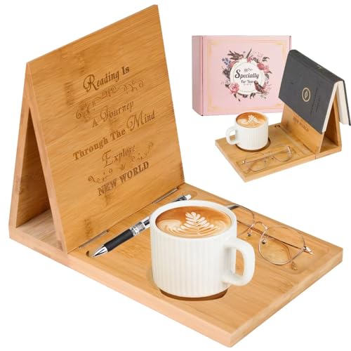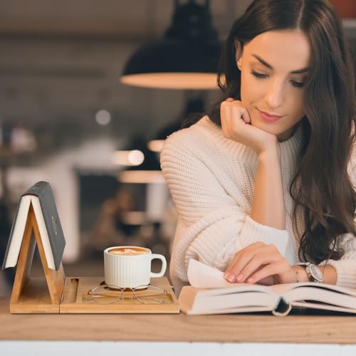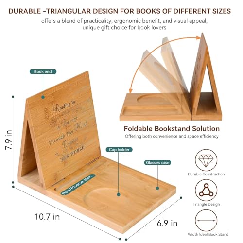 GOARTGIF - Bamboo Book Rest Stand,Foldable Triangle Book Holder,Book Nook Reading Valet with Cup Holder,Book Place Holder for Bedroom Nightstand,Birthday Gift for Book Lovers,Unique Mother's Day Gifts