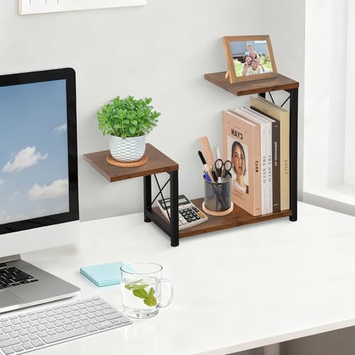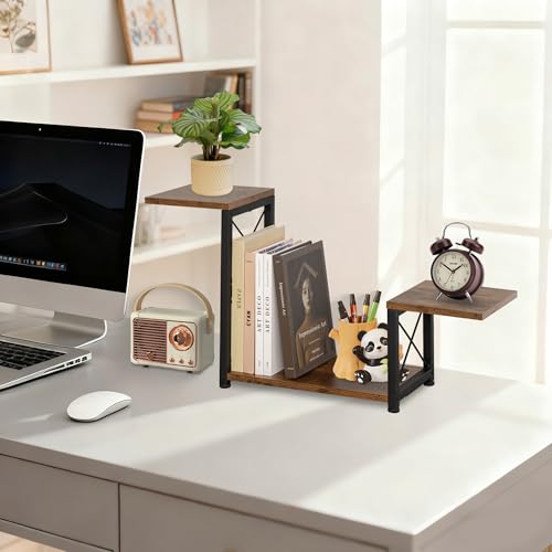 - SPACE-SAVING DESIGN: This 3-tier desktop shelf is designed to help you maximize space on your desk or office desktop. It's perfect for storing books, office supplies, spice vases, plants, and cherished keepsakes. Moreover, the rustic and aesthetic wood grain design of the organizer adds a decorative touch to your home or office