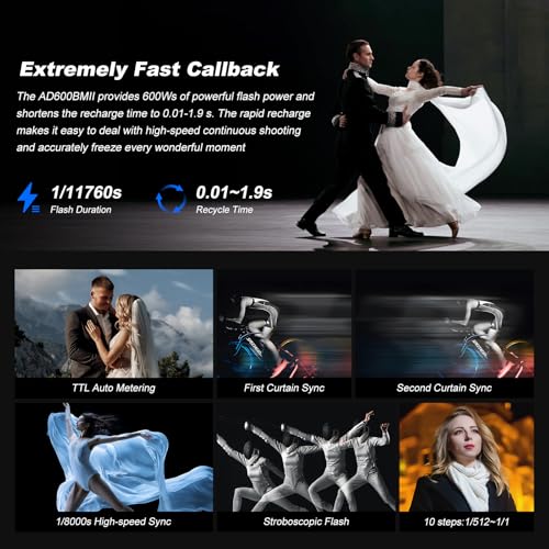 - أداء قوي وإعادة شحن سريعة: يتميز فلاش AD600BMII من جودوكس بقدرة إضاءة قوية تبلغ 600 وات/ثانية وزمن إعادة شحن يتراوح بين 0.01 إلى 1.9 ثانية، مما يتيح استعادة سريعة وسهولة في التقاط اللقطات المتتالية عالية السرعة بدقة، لتوثيق كل لحظة مثيرة.