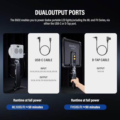 - 【Dual Output Ports Intelligent Battery Monitoring】GODOX BG02 has two outputs,USB-C and D-Tap,which are widely compatible with a variety of LED lighting devices on the market, and there is a battery indicator at the top of the handle,which clearly shows the remaining battery level for easy monitoring at any time.