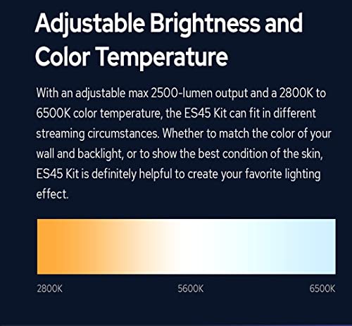 - سطوع قابل للتعديل ودرجة حرارة اللون: مع مخرج بحد أقصى 2500 لومن قابل للتعديل ودرجة حرارة لون من 2800 كلفن إلى 6500 كلفن، يمكن لمجموعة ES45 أن تناسب ظروف البث المختلفة. سواء كنت تتطابق مع لون الحائط والإضاءة الخلفية أو لإظهار أفضل حالة للبشرة، فإن مجموعة ES45 ستساعد على خلق تأثير الإضاءة المفضل لديك