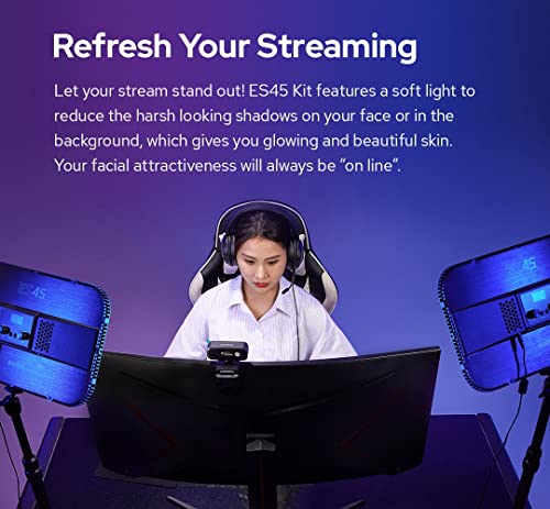 - جدد البث الخاص بك: تتميز مجموعة ES45 بضوء ناعم لتقليل الظلال القاسية على وجهك أو في الخلفية، مما يمنحك بشرة متوهجة وجميلة. ستكون جاذبية وجهك دائمًا "على الخط"