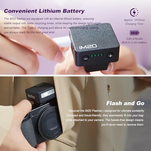 GODOX - فلاش كاميرا iM20 ميني سبيدلايت - 470 مللي أمبير/شحن Type-c/440 ومضة بكامل الطاقة/زمن إعادة شحن 3 ثوانٍ/5 مستويات طاقة/يدوي، فلاش كاميرا لسوني zve10/سوني zv1/سوني a7iii/ريكو gr3/فوجي فيلم f1 وغيرها من