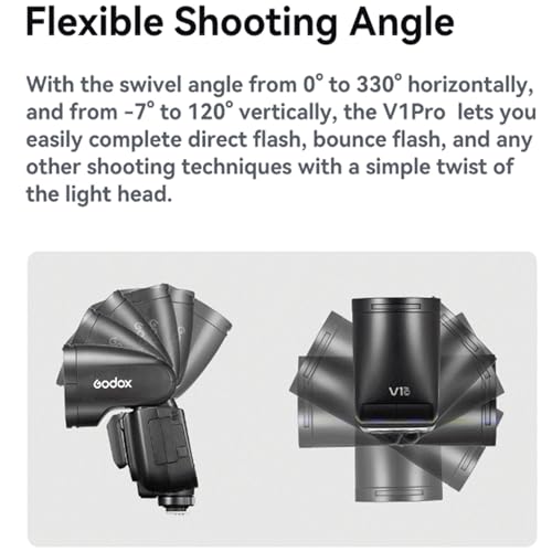 - 📷【نقل واستقبال لاسلكي وزاوية تصوير مرنة】يدعم V1 برو اس الإرسال والاستقبال اللاسلكي 2.4 جيجا، مما يسمح بدمجه بسلاسة مع ومضات غودوكس الأخرى في ترسانتك. اصنع روايات الإضاءة الفريدة الخاصة بك مع إعدادات الإضاءة المتنوعة بسهولة. مع زاوية الدوران من 0 درجة إلى 330 درجة أفقيًا، ومن -7 درجة إلى 120 درجة رأسيًا، يتيح لك V1 برو إكمال الفلاش المباشر والوميض المرتد وأي تقنيات تصوير أخرى مع لف بسيط لرأس الضوء.