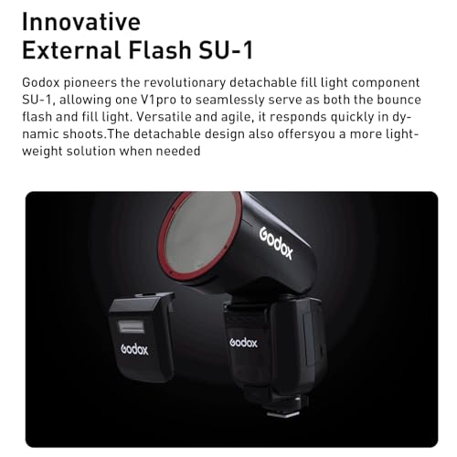 - 🏆【InnovativeExternal Flash SU-1】Experience the future of flash photography with the innovative Godox SU-1. This game-changing detachable fill light component redefines versatility, as it seamlessly transforms the V1Pro into both a bounce flash and a fill light. Designed for dynamic shoots, the SU-1 responds swiftly, ensuring you never miss a moment. Plus, its detachable design provides a lightweight solution whenever you need it. Stay agile and take your photography to new heights with the Godox SU-1 External Flash.