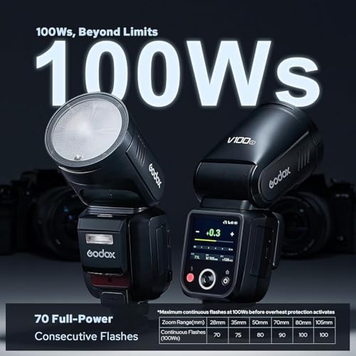 - 70 Full-Power Consecutive Flash: With an advanced cooling system, the V100-C can deliver 70 to 100 consecutive full-power flashes at 100Ws, ensuring high shooting efficiency and flexibility