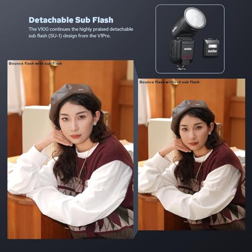 - Detachable Sub Flash for Versatility: The V100-C includes a detachable sub flash (SU-1), allowing for dual-light setups and creative lighting solutions. This feature is particularly useful for portrait photographers looking to add depth and dimension to their work