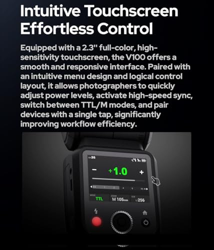 - شاشة لمس حساسة للألوان¡¿ تم تجهيز V100 بشاشة لمس ملونة عالية الدقة وحساسية عالية 2.3 انش مع عرض معلومات بديهية وتشغيل مريح باللمس، مما يحسن بشكل كبير من الكفاءة عند التصوير. يوفر جهاز غودوكس V100 طريقتين للتشغيل يمكن تشغيلهما من خلال الأزرار المادية والمحدد.