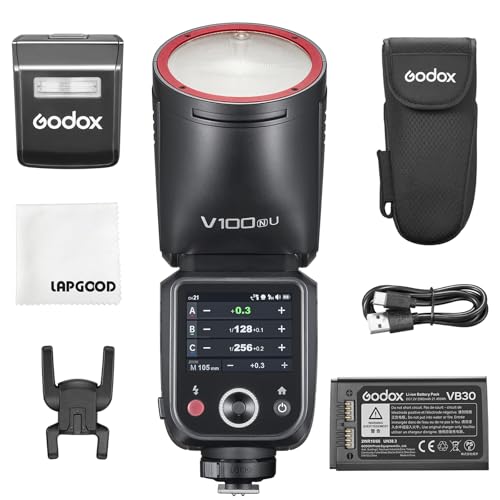 GODOX - غودوكس فلاش كاميرا V100-N TTL 100 واط لنيكون، فلاش كاميرا لاسلكية برأس دائري 2.4G مع فلاش خارجي SU-1، HSS 1/8000s 2980mAh، جهاز فلاش غودوكس V1Pro N مطور