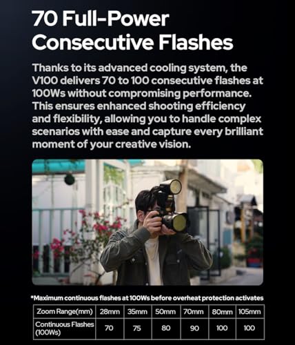 - أداء فلاش قوي: أداء فلاش غودوكس V100 1/1-stop (M-Stop) يصل إلى 100 واط، مع 81 مستوى من نطاق التعتيم (1/1~1/256 أو 2.0~10) لضبط مجموعة واسعة من احتياجات التصوير من الإضاءة المنخفضة إلى الإضاءة القوية. طاقة 100 واط، عدد ومضات متتالية تصل إلى 70 ~ 100 مرة.