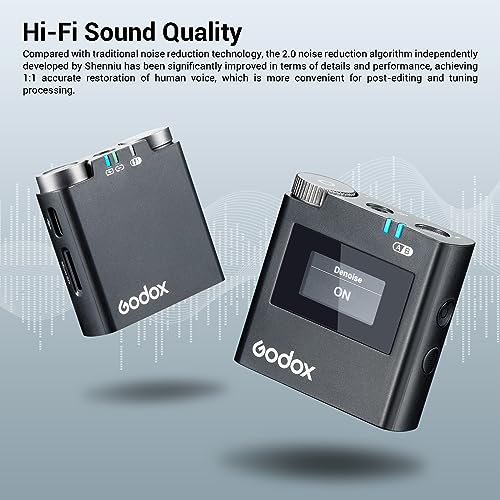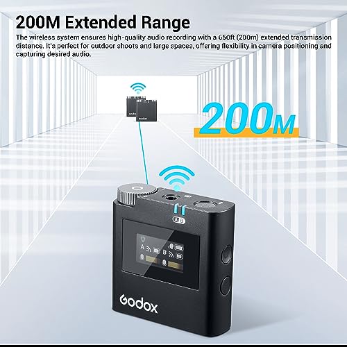 GODOX - نظام ميكروفون لاسلكي فيرسو من جوديكس S M2 2.4GHz لكاميرا سوني وجهاز استقبال هوت شو بخاصية الغاء الضوضاء مع ناقل حركة بطول 200 متر وتسجيل داخلي وميكروفون لافالير مزدوج القناة لسوني، أحادى، أسود