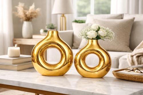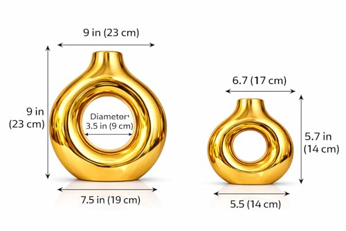 Generic - طقم فازات سيراميك ذهبي دائري مجوف، قطعتين بتصميم عصري، 9 إنش و 6.7 إنش، للديكور المنزلي والزهور