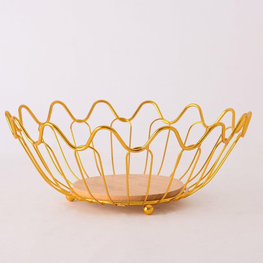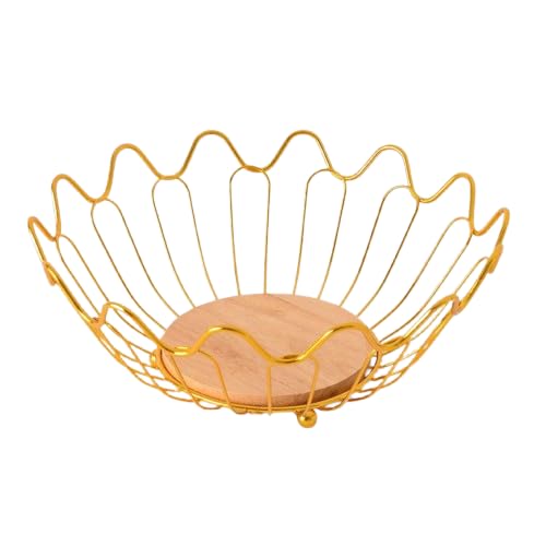 Gold Metal Decorative Fruit Plate with Natural Wooden Base Elegant Hospitality Stand Modern Fruit Organizer for Living Room Table Decor Z