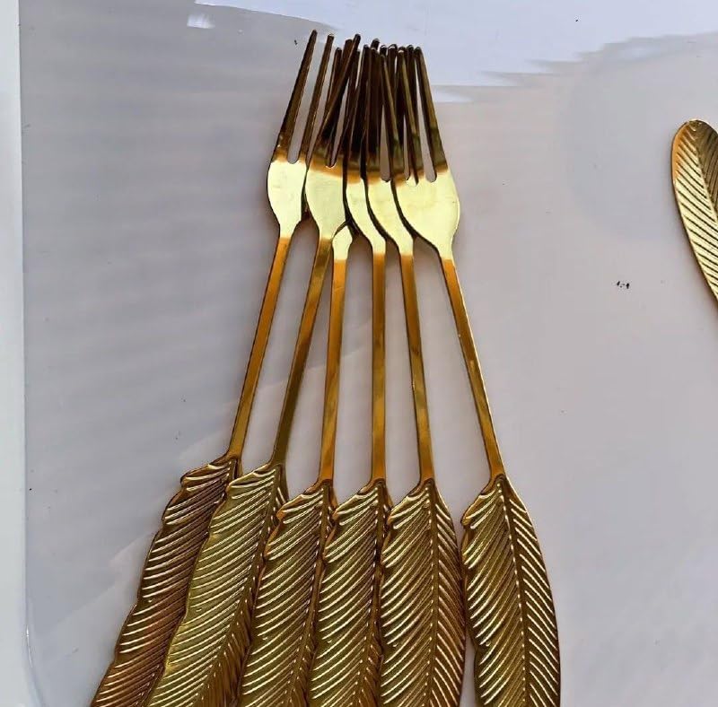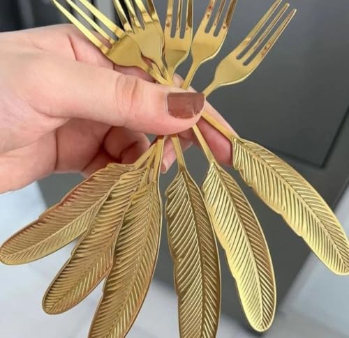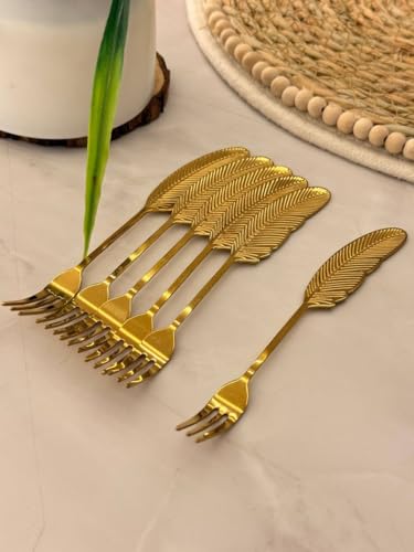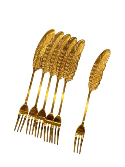 Generic - طقم شوك حلويات معدنية ذهبية بتصميم ريشة 6 قطع - شوك تقديم صغيرة فاخرة بتصميم عصري وأنيق للمناسبات الراقية l