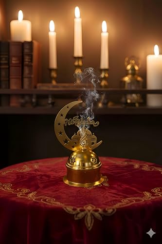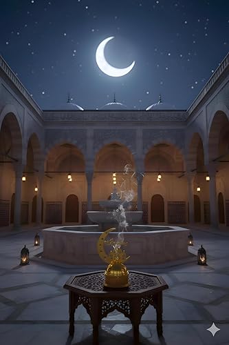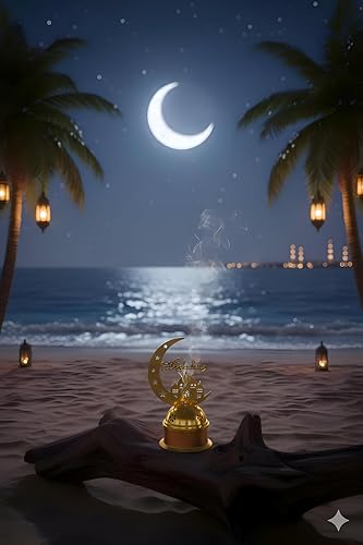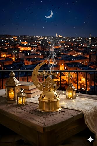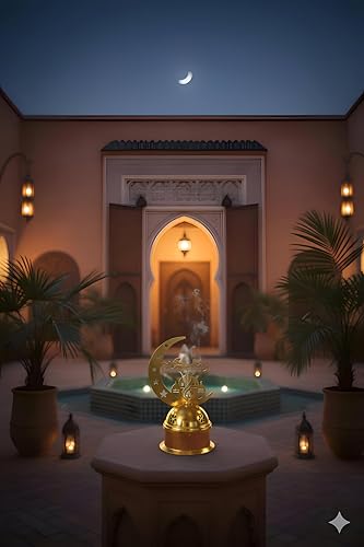 - This elegant Ramadan incense holder features a golden crescent and mosque design, embodying the spiritual essence of the holy month with timeless Islamic artistry.