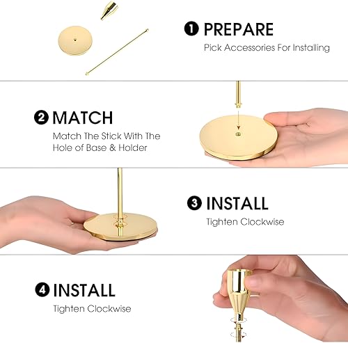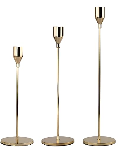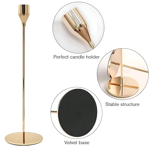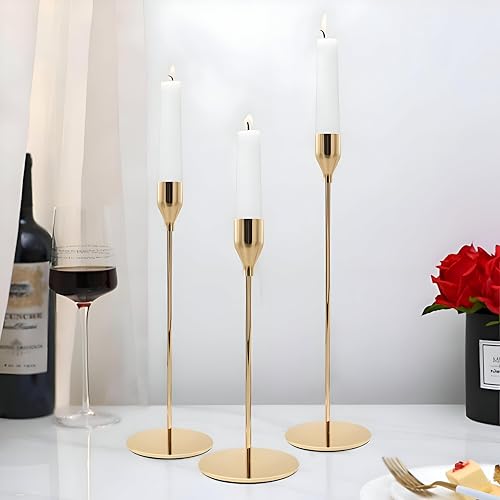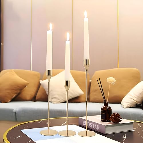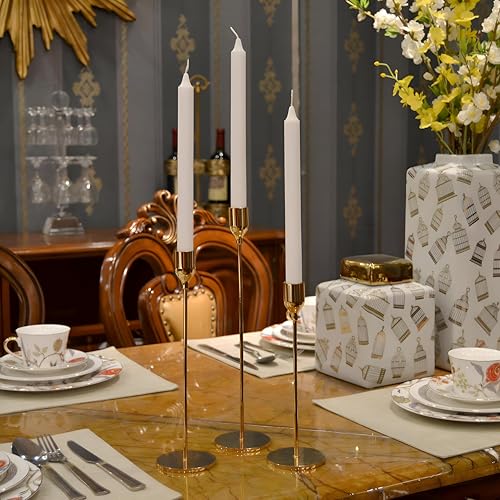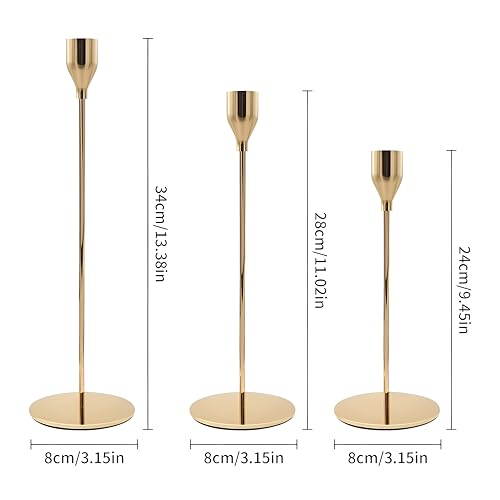 - Set of 3 metal candle holders in three different heights (9.4, 11.4, and 13.4 inches), designed to fit candles of 0.86-inch diameter, offering a refined layered decoration effect for tables and events.