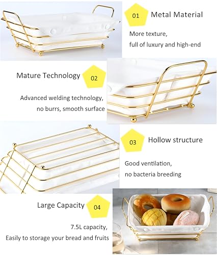 - السلة السلكية الذهبية هي صينية تقديم متعددة الاستخدامات وأنيقة يمكن استخدامها للفواكه والخبز وغيرها من الأشياء مثل الكعك والوجبات الخفيفة واللوازم المكتبية. تصميمها الإبداعي يجعلها قطعة مركزية مثالية للمطبخ أو طاولة الطعام أو حتى للحفلات الخارجية.