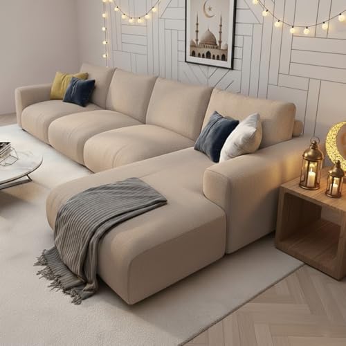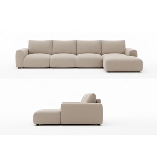 Generic - ركنة من جولدن لايف على شكل حرف L بقماش الكتان، لون بيج ، خشب زان، 300 سم عرض، شيزلونج 200 سم، مع 4 خداديات، قطعتين