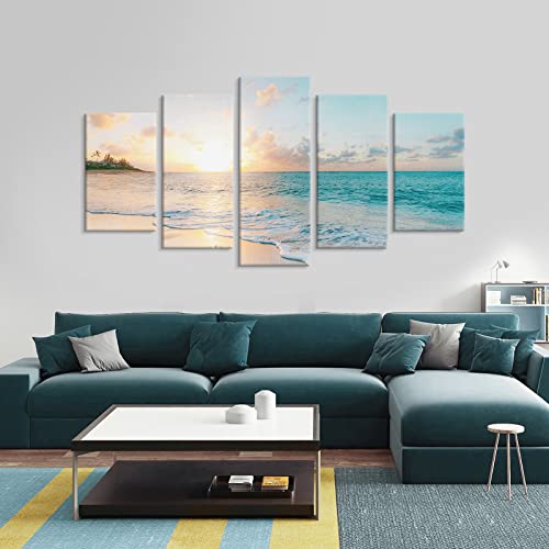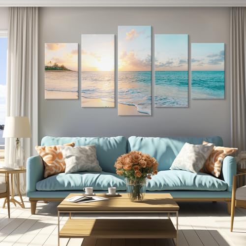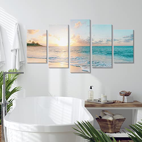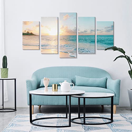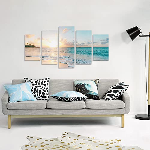 Goldfoilart - Goldfoilart 5 Pieces Beach Sunset Canvas Wall Art Blue Sea Prints Romantic Ocean Waves Pictures Painting for Living Room Bedroom Home Decorations Wall Decor Ready to Hang