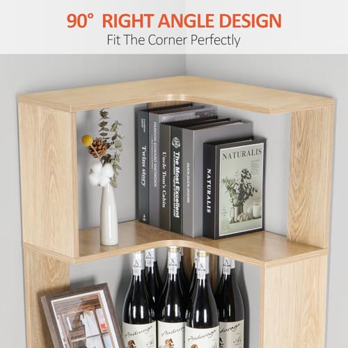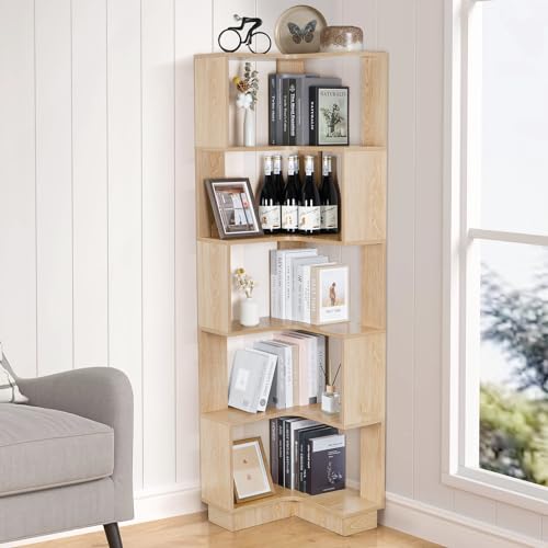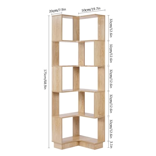 GOOFCXO - 5 Tiers Corner Bookshelf, 68.9" Tall Wooden Corner Bookcase Large Open Bookshelf L-Shaped Storage Display Rack with Fixture for Living Room Bedroom Study Office