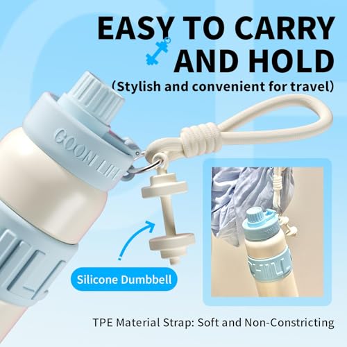 - SPILL-FREE SIPPING ON THE GO: GOOM water bottle fits snugly into all standard car cup holders, whether you’re powering through traffic or hitting the trails, your favorite drink stays secure, accessible, and spill-free. A silicone barbell charm isn’t just a playful accessory—it’s functional, giving your bottle an extra grip while turning heads with its stylish design.