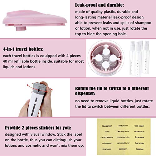 - Perfect for Traveling 4-In-1 travel lotion dispenser. With 4 refillable bottles inside, you could take up to 4 kinds of personal lotions and cosmetic with one single ColorCoral lotion dispenser. This travel bottle don’t take up much space in you luggage case or backpack, free your time from organizing your travel gears.