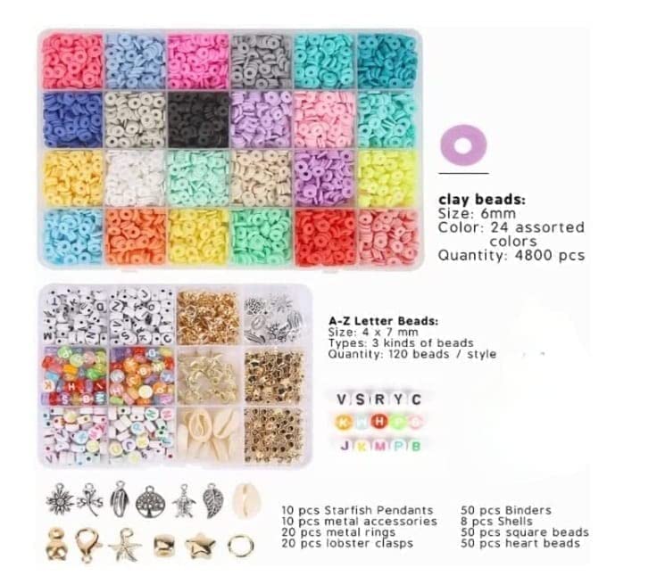 - محتويات العبوة: 3800 قطعة من 24 لونًا مختلفًا من خرز الزينة بوني 4 ملم، 880 قطعة من خرز الأبجدية، 10 قطع من الإكسسوارات المعدنية، 10 قطع حلقات معدنية، 1 مقص و3 لفات من خيوط الأسلاك بطول 6 أمتار. خرز الحروف الأبجدية المصنفة يُخزن حسب كل لون في صندوق 3 × 4. أما الخرز الملون يكون في صندوق 4 × 6.