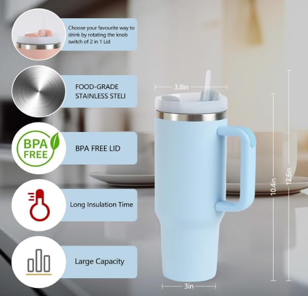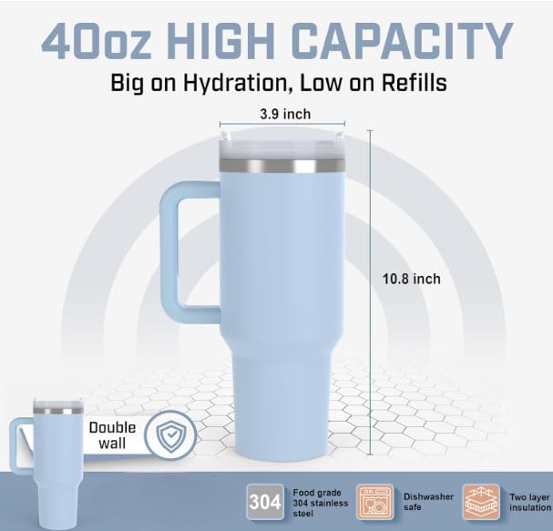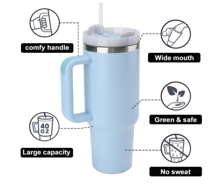 Gracieux Moda - 40 oz Tumbler with Handle and Straw | Stainless Steel Tumbler With Lid and Straw | Reusable Vacuum Insulated Cup | Travel Hot and Cold Coffee Mug | Insulated Water Bottle | Sky Blue