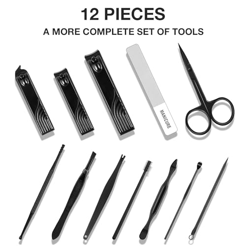 GRACIOUS MART - GRACIOUS MART 12pcs Nail Clipper Manicure Set Pedicure Care Tools Stainless Steel Women Grooming Kit Travel Case (BLACK)