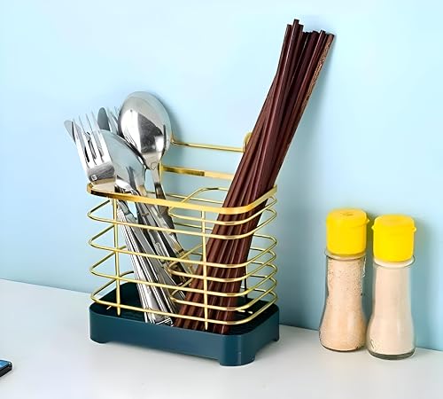 Generic - Green and Gold Hanging Metal Mesh Cutlery Drying Rack, 2 Compartment Drain Basket for Chopsticks, Spoon, Fork, Knife Holder, Best Product Supplier 🎁 Al-Isra