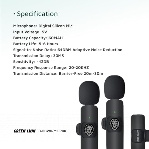- Specification Brand: Green lion Sensitivity: 42dB Range: 20m Battery Capacity: 60mAh Ports: USB-A/Type-C/Lightning Features Highly Sensitive Clear Timbre Plug & Play Long-Lasting Battery