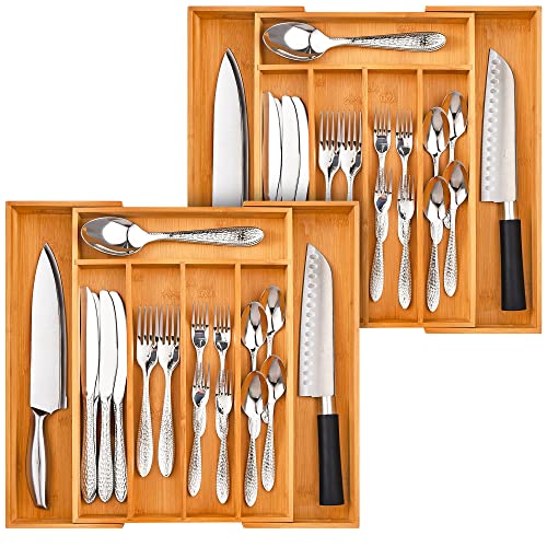 Greenual - منظم أدوات المائدة والمطبخ الفضية بتصميم مسطح قابل للتوسيع من خشب البامبو لتنظيم أدراج المطبخ والدولاب من جرينوال، عبوة من قطعتين، مقاس 38 سم