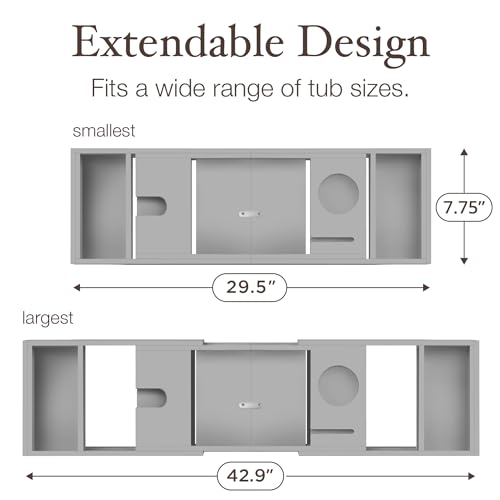 - Adjustable to Fit Most Tubs - The bath caddy tray for bathtub extends from 29.5” to 42.9” to fit nearly all tub sizes. No tools required—simply slide to adjust and enjoy the perfect tub tray for bathtub setup.