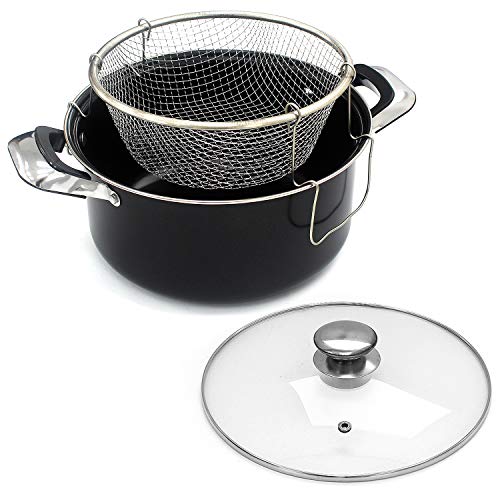 Guaranteed4Less - 24cm Deep Fat Fryer Non Stick Chip Pan Casserole Pot Fry Frying Basket Glass Lid