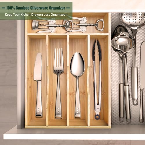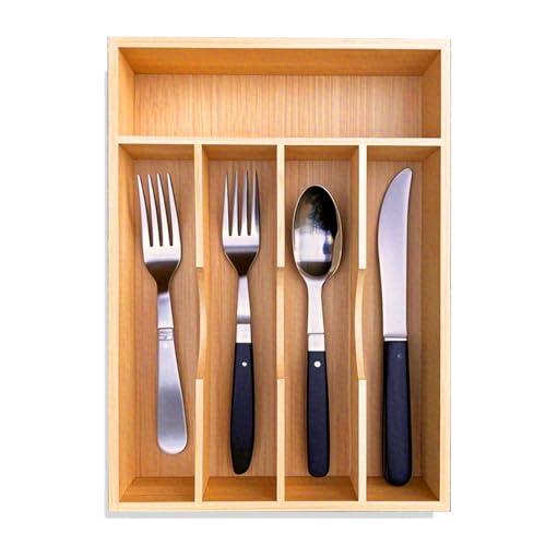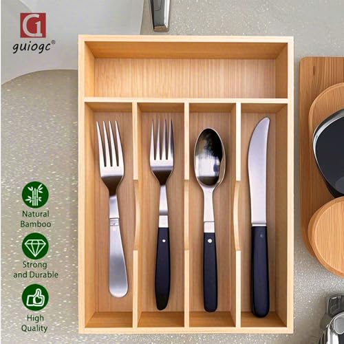 guiogc - منظم ادوات المطبخ الفضية من الخيزران حامل صينية المائدة 9 انش للادراج الصغيرة علبة خشبية لادوات والسكاكين 5 فتحات